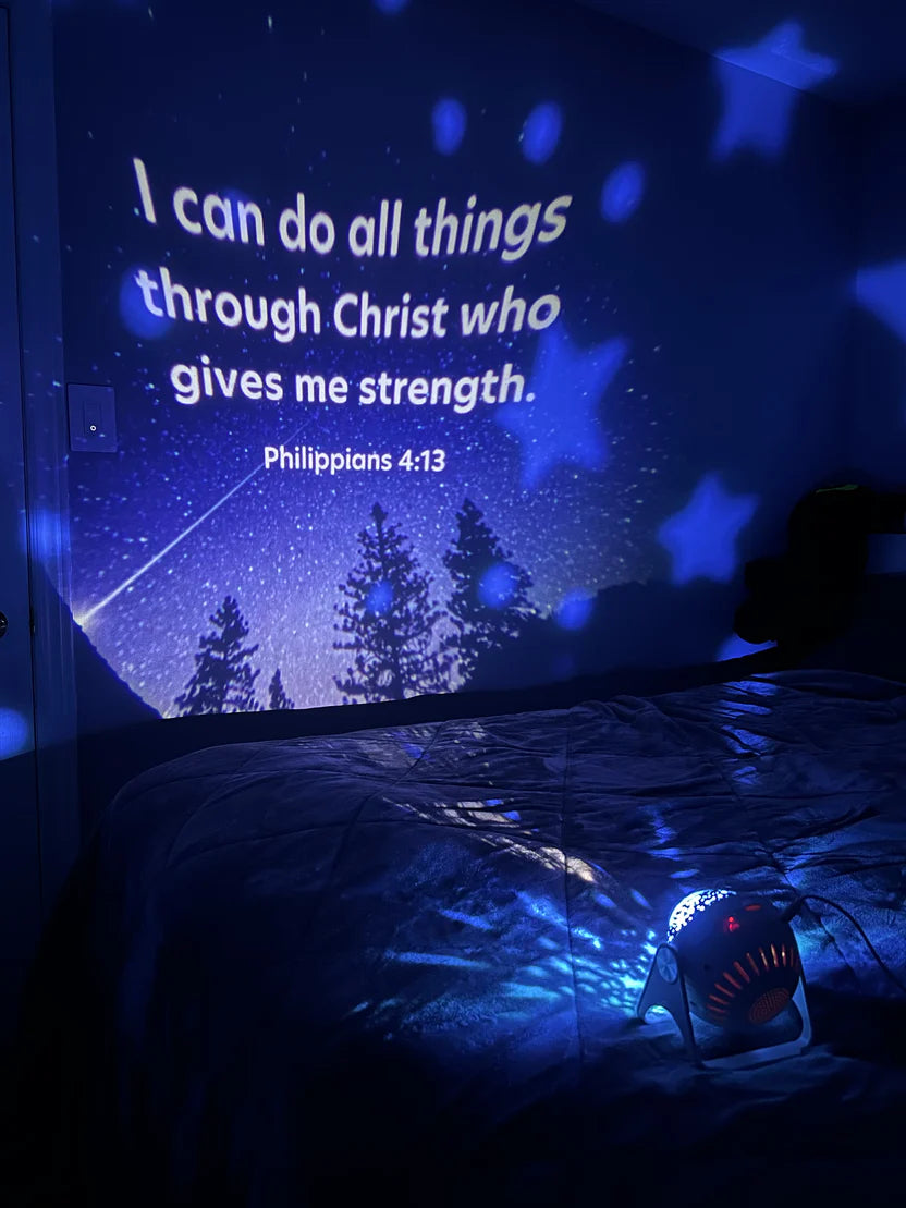 This projector is such a blessing. It fills my space with comfort, motivation, and Scripture — a perfect companion for my nightly Bible study.