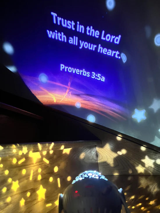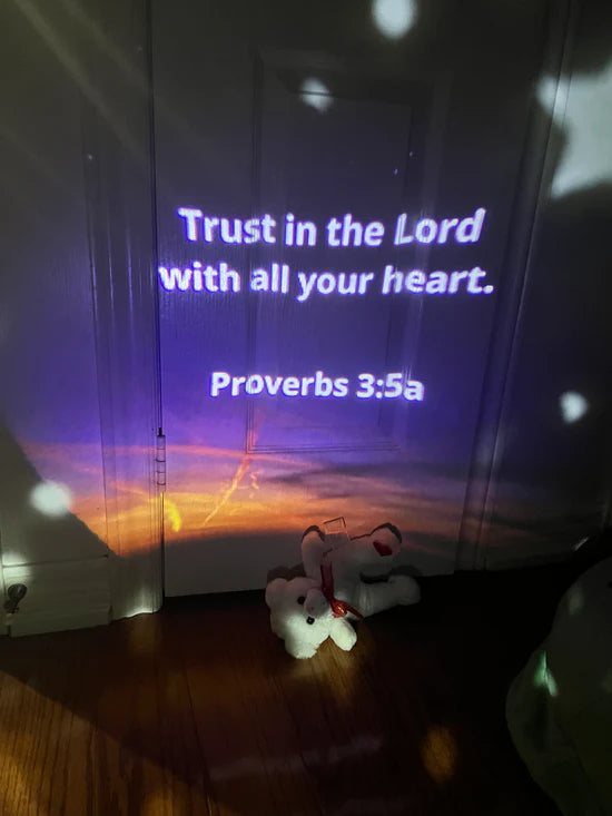 Simply insert a disc, and it projects an inspiring Bible verse surrounded by gentle, glowing stars — creating a captivating and faith-filled display.