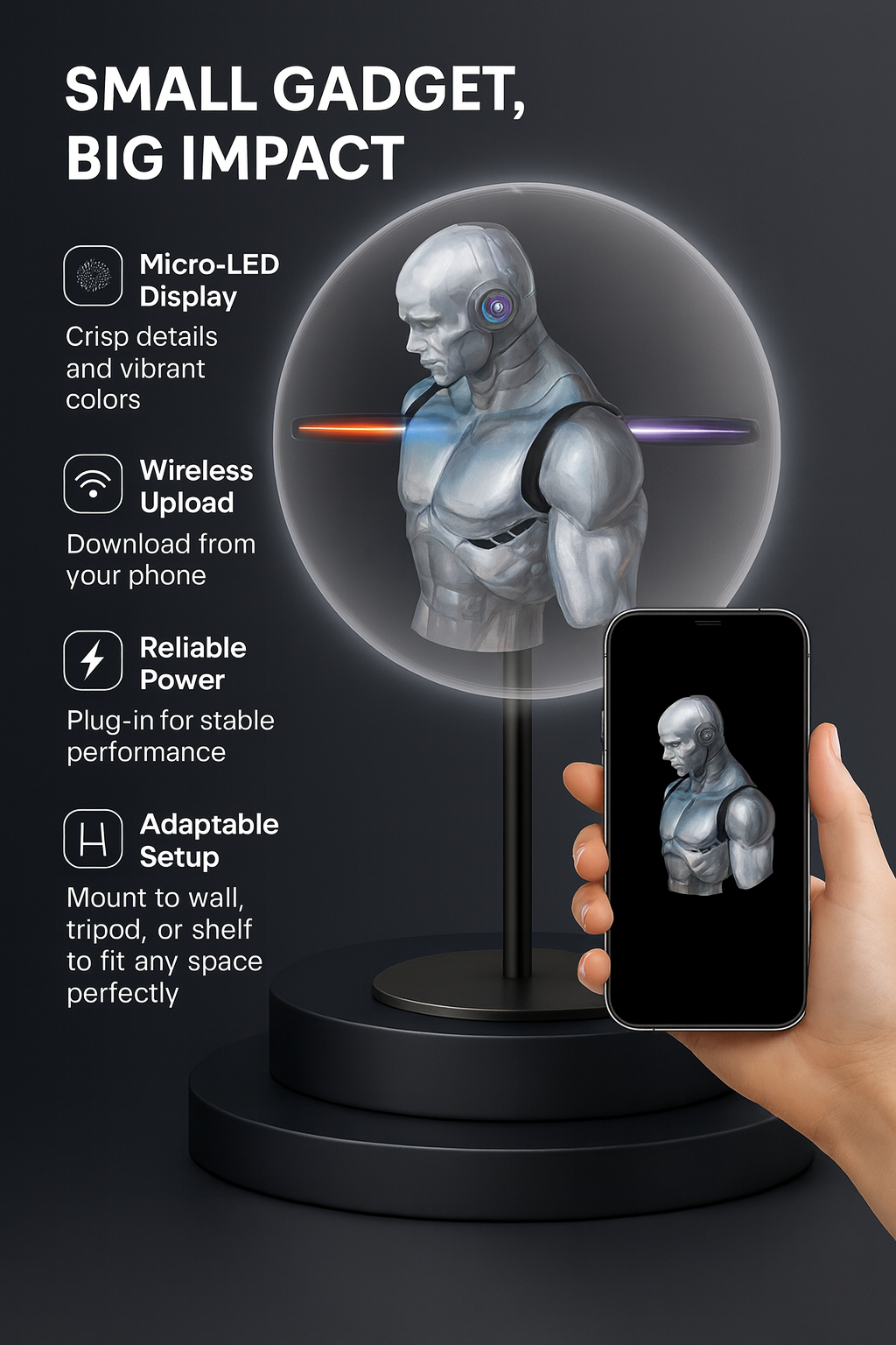 From sci-fi emblems to anime scenes or your personal logo, the Mini 3D Hologram Fan brings your vision to life with bright, floating clarity.